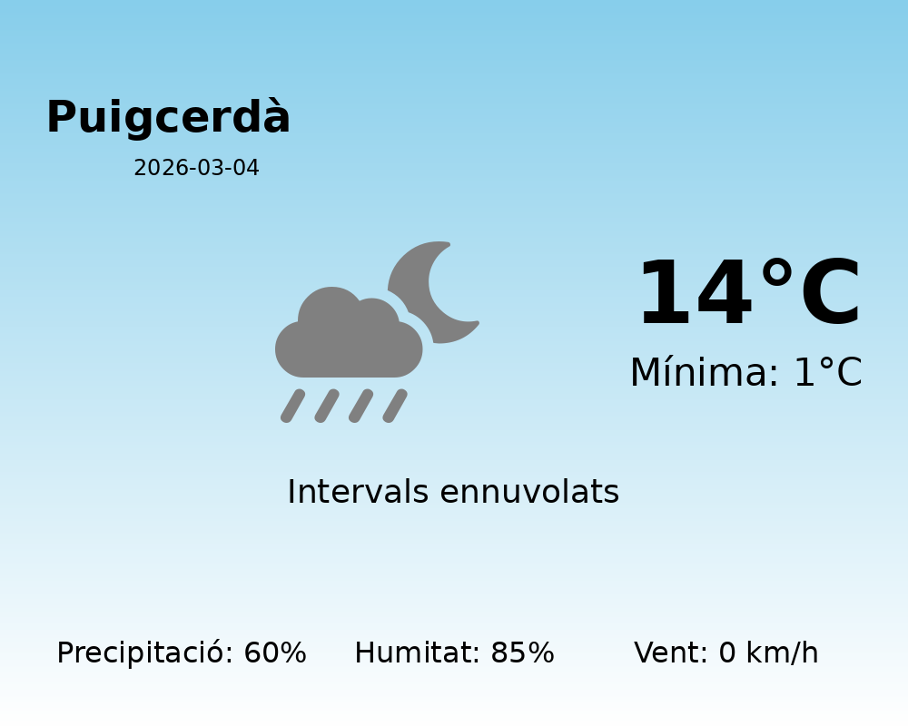En resum, la jornada a Puigcerdà estarà marcada per temperatures agradables durant el dia, núvols intermitents i una alta probabilitat de pluja que els residents i visitants hauran de tenir en compte.