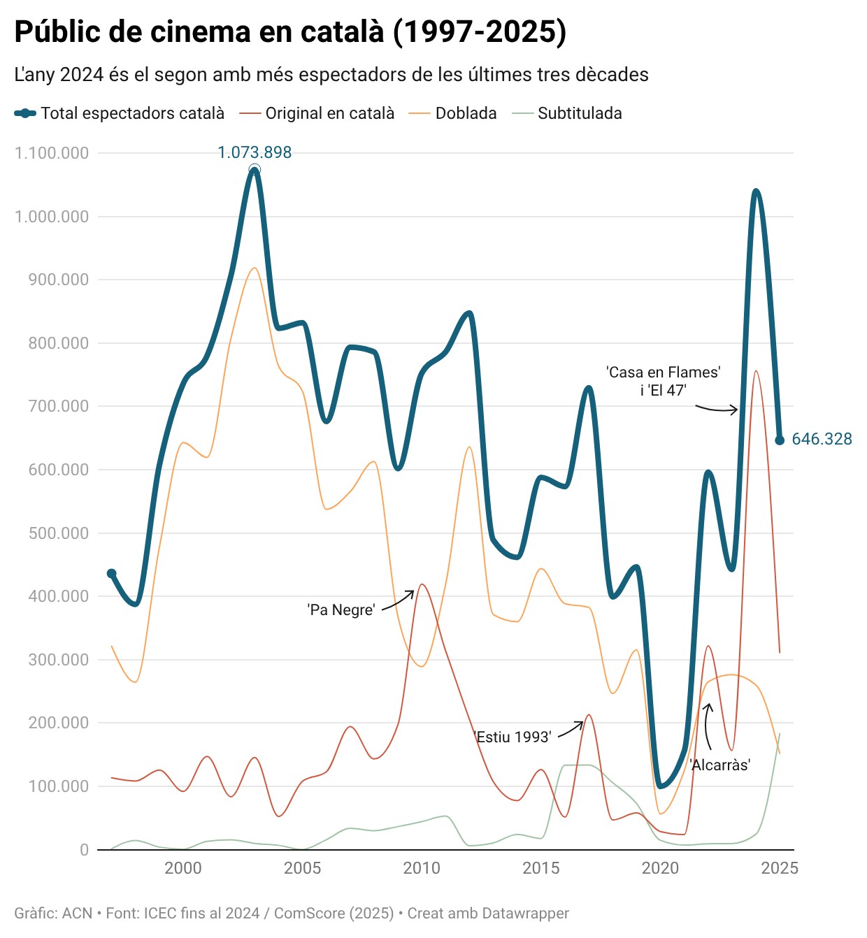 El 2025 s’ha registrat la segona millor marca fins ara, amb el català apropant-se al 5,5% del total d’espectadors, amb dades provisionals de ComScore, que no inclouen algunes sales petites que solen fer créixer lleugerament el percentatge. A falta, doncs, de dades d’algun cinema petit, el català ha tancat l’any amb 646.328 entrades venudes. D’aquestes, pràcticament la meitat són per a films en versió original (311.178), una xifra que no arriba ni a la meitat de l’històric 2024. Els doblatges també han anat a la baixa (151.979 espectadors), amb el mínim de la sèrie fins ara, deixant de banda els pandèmics 2020 i 2021. Per contra, les projeccions de films subtitulats al català han arribat a cotes més altes que mai (183.171).