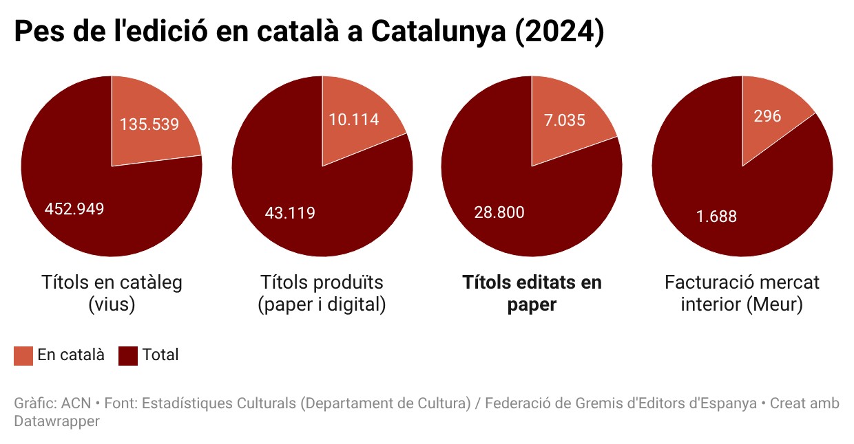 El pes dels llibres en català dins de tota la producció total del sector a Catalunya (suma de paper i digital) és similar a la seva representació en l’edició física. És a dir, l’oferta en català es va situar el 2024 en el 23,4% del total (una lleugera baixada d’un punt interanual), amb 10.114 títols físics i digitals editats en català, dels 43.119 apareguts en totes les llengües. En àmbit dels títols ‘vius’ (en catàleg), el català és una mica més present que en el de les novetats anuals, amb un fons que representa gairebé el 30% del total, amb més de 135.000 títols en català.