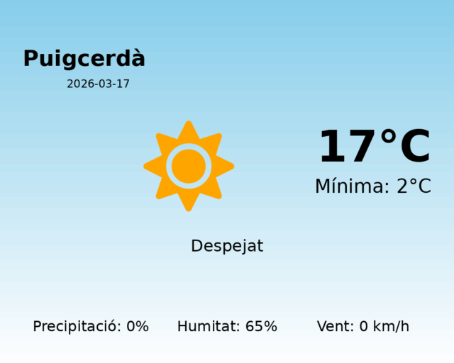 En resum, Puigcerdà viurà un dia assolellat, tranquil i sense precipitacions. Perfecte per gaudir entorn a l’aire lliure o per passejar pel bonic entorn natural que envolta aquest indret.